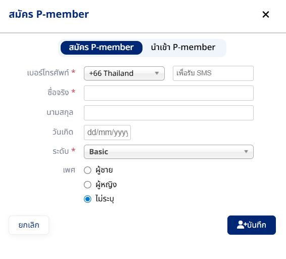 - ทดลองสมัครสมาชิกด้วยรูปแบบ P-Member (P-Member คือสมาชิกที่ทางร้านสมัครให้ลูกค้าเอง โดยสมาชิก P-Member จะมีตัว P อยู่ข้างหน้า)