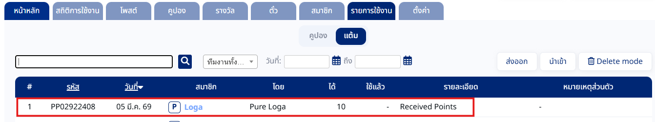 5. เมื่อให้แต้มเรียบร้อย สามารถตรวจสอบรายการใช้งาน “แต้ม” ตรงแท็บ รายการใช้งาน