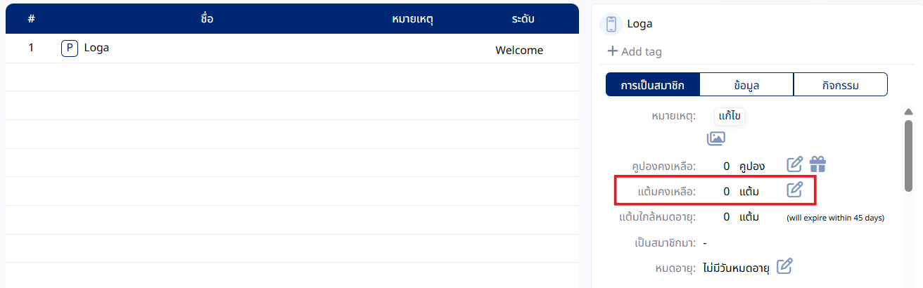 4. แอดมินสามารถทำการให้แต้มลูกค้าได้ โดยกดตรง แต้มปัจจุบันของลูกค้า